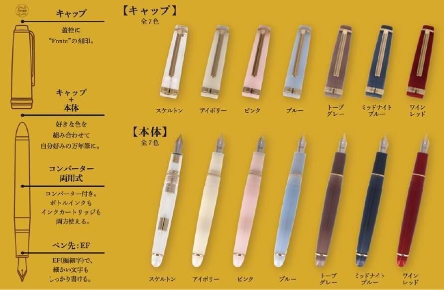 好きな色の本体とキャップを組み合わせて、特別な万年筆を作りあげることができます。