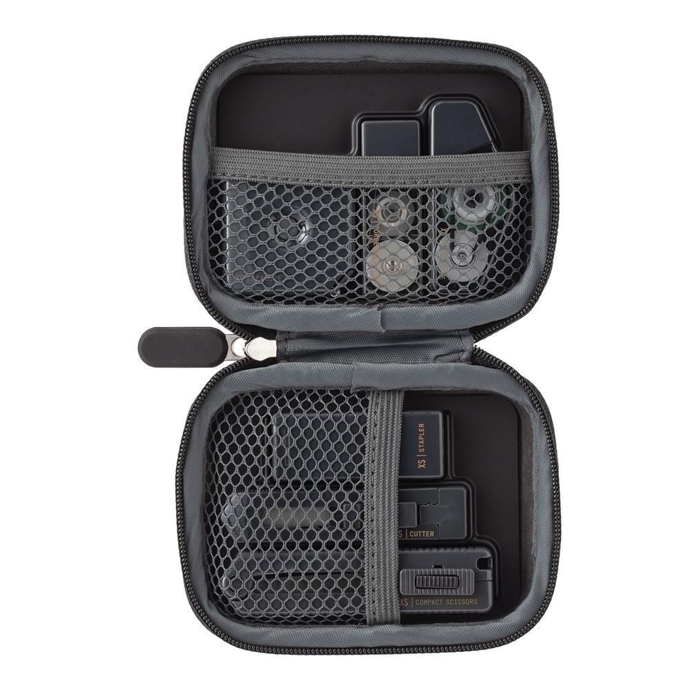 「XS」シリーズの、『コンパクトハサミ』『コンパクトホッチキス』(新サイズ)『修正テープ』『テープのり』『カッター』『メジャー』の6アイテムが専用ケースに入ったセットです。